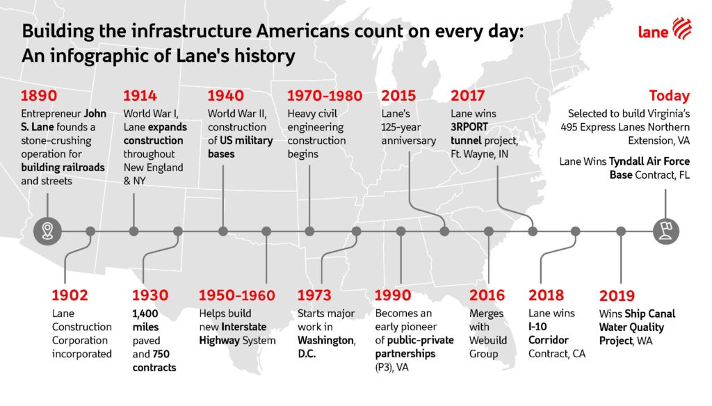 For 135 years, Lane has been building the infrastructure Americans count on every day. From humble beginnings and a $10,000 investment, Lane has endured many challenges over its storied history. Today we are writing a new chapter with Webuild, sharing a global vision, talent, innovation, and a common mission. With a legacy that equals trust, we are shaping more livable communities, respecting all environments, and aiming at excellence as we continue to contribute to a better future.