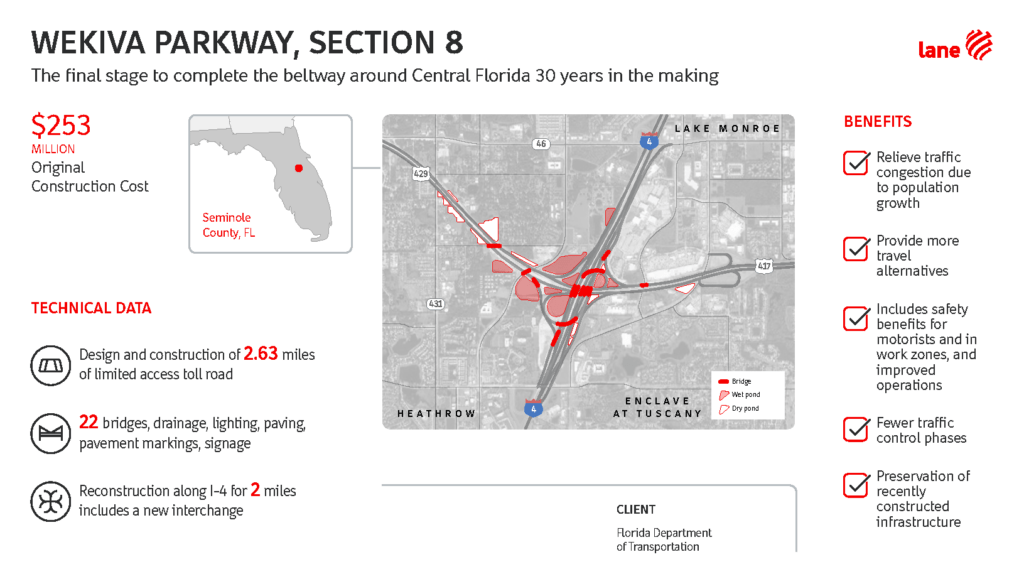 This key piece of the Wekiva Parkway provides travel alternatives and relieves traffic congestion resulting from population growth in Orange, Lake, and Seminole counties.