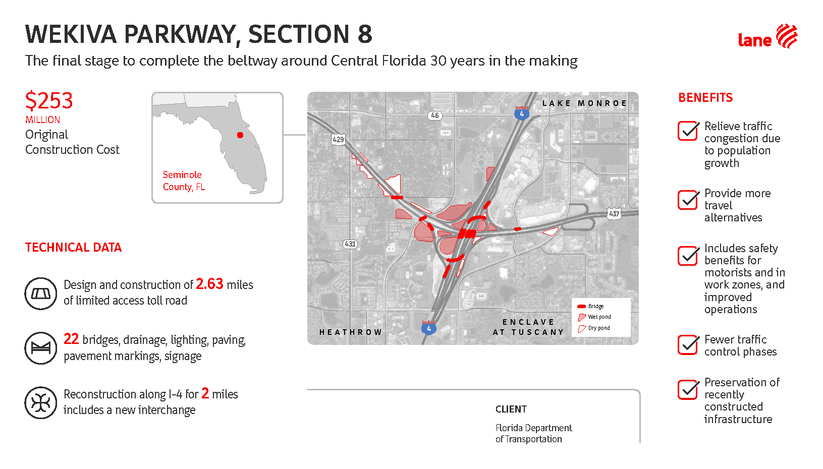 The Wekiva Parkway Section 8 contract is the final link of the overall 25-mile tolled Wekiva Parkway improvements that completes the beltway around Central Florida, which has been in planning and construction for over 30 years.