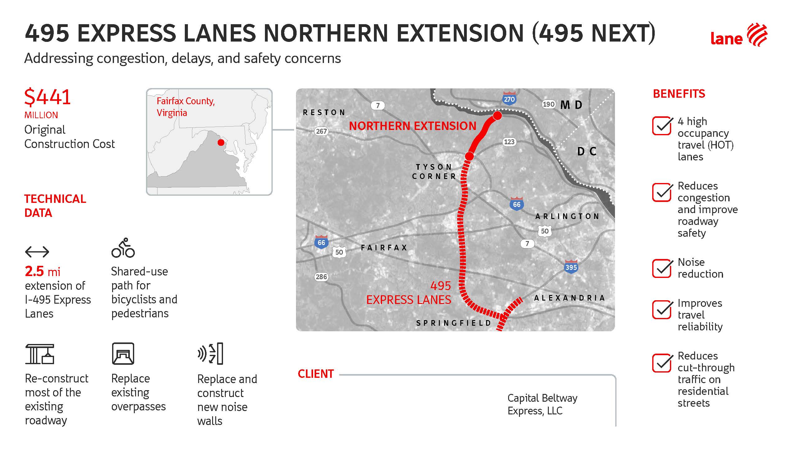 The Washington, D.C. metropolitan area is one of the most congested regions of the United States and the population continues to grow. As a result, traffic volumes are rising along the I-495 corridor, causing congestion, delays, and safety concerns. There is a strong need to address existing and future travel demands and relieve pressure on the general-purpose lanes in the area.