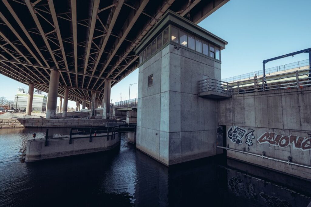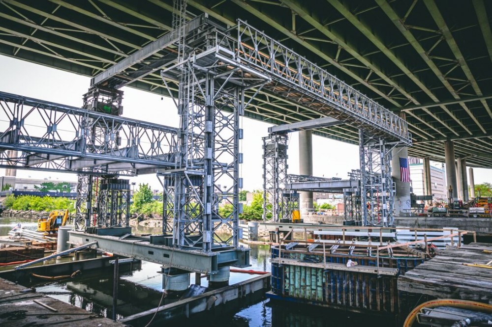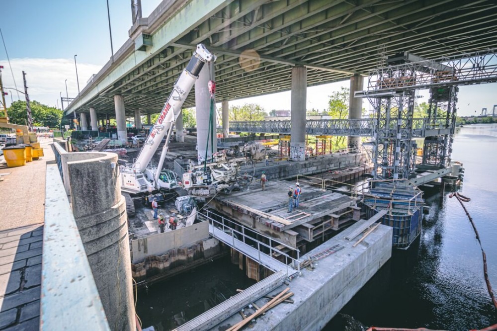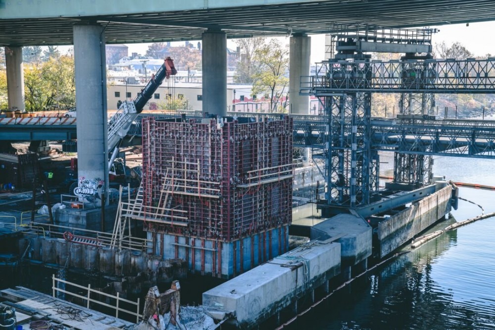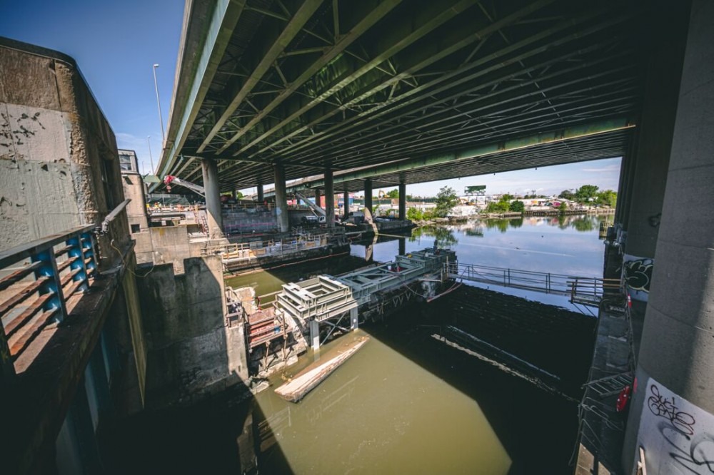 The construction of the bridge was carried out in 10 stages, with a 48-month duration. The main construction challenge was keeping the busy waterway navigable and critical arterial route open while replacing the entire bridge. To accomplish the difficult task the team constructed two temporary bridges to maintain vehicle traffic, erecting the final bascule span in an open position, and accomplished all work in the navigation channel within a critical time frame.